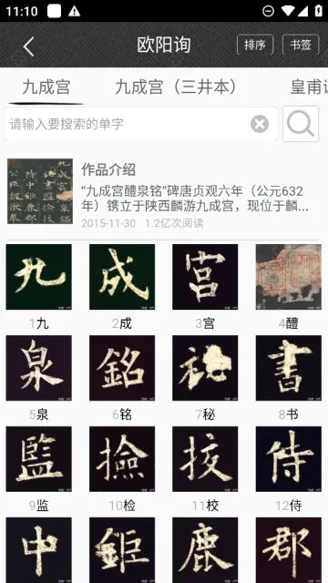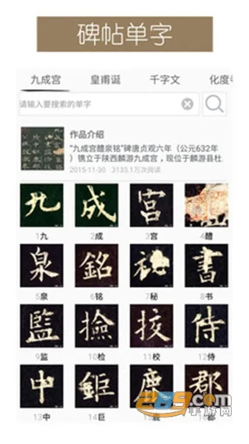 1、丰富的碑帖资源,有各种类型的碑帖,还把经典书法碑帖截成单字图片,配上米字格,方便用户准确地在手机端读帖临帖。