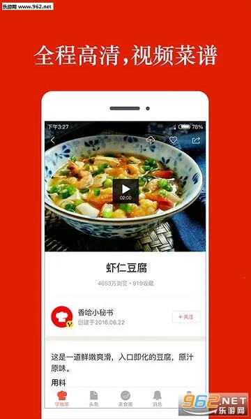 2、教学方式多样:有详细的图文教程和原创高清视频教程,名厨在线指导,步骤详尽,新手也能轻松上手,还新增百万菜谱视频,让小白做菜更简单。