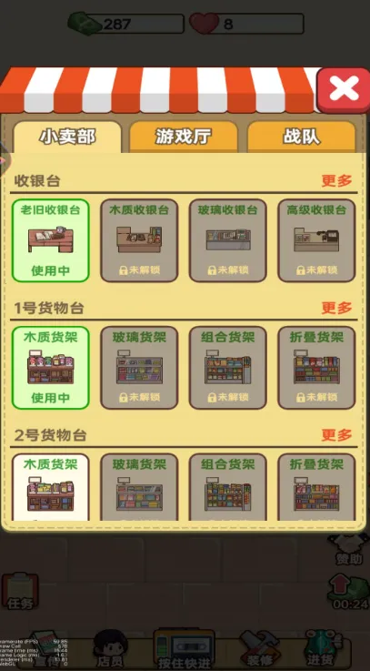 新开小卖部是一款经营游戏,玩家拥有自己的小卖部,通过努力丰富商品、招募员工等做大做强。有多样活动任务,能通过顾客挑战获材料货币,还有店员匹配等玩法,锻炼经营思维,体验创业乐趣。