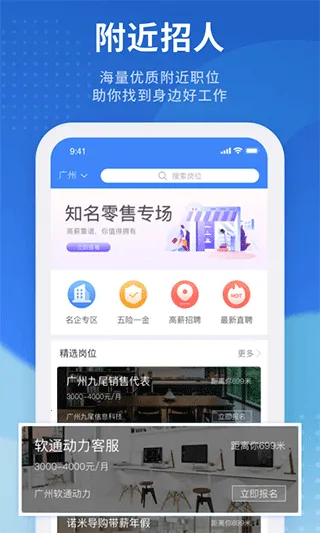 4. 同城模式下提供许多附近工作,无需跑太远就能求职,且能在上面发送简历,让企业更好了解自己,便于开展后续工作。