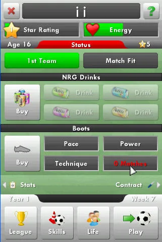 2. 有5种技能可提高,如速度、力量、技术、视觉和任意球技能等,还有20双靴子可选购提升球员技能。