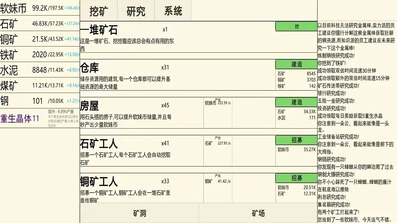 重生挖矿是文字模拟经营手游,玩家通过点击获取多种矿石资源,用于科技研究、建造设施、升级器械。游戏玩法丰富,有循环发展模式,操作简便,资源管理与科技研究结合,助你打造专属矿场帝国 。