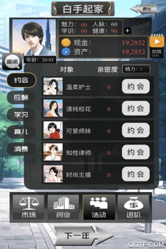 3、它玩法多样,有市场、创业等玩法,玩家可结婚交友育儿购物。操作轻松,是点击放置类游戏,没有复杂操控,能自由发挥创意经营商业。