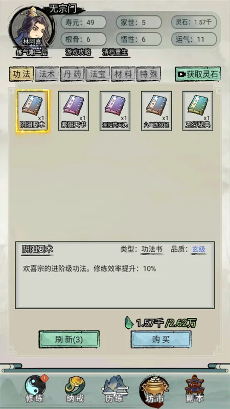 2、丰富养成:拥有涵盖寿元、境界、灵气等众多属性的养成系统,部分属性开局可选择,影响修仙之路,还有功法、丹药等元素。