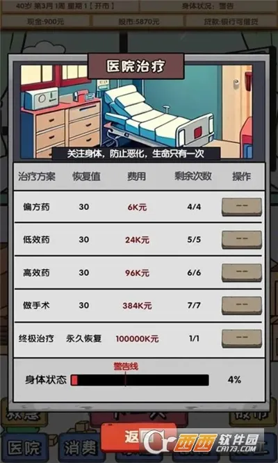 2、游戏玩法丰富,有多种系统。股票系统可体验炒股,银行系统能贷款炒股,打工系统可做兼职,还有医院、消费、家庭等系统,增添了游戏的趣味性和真实感。