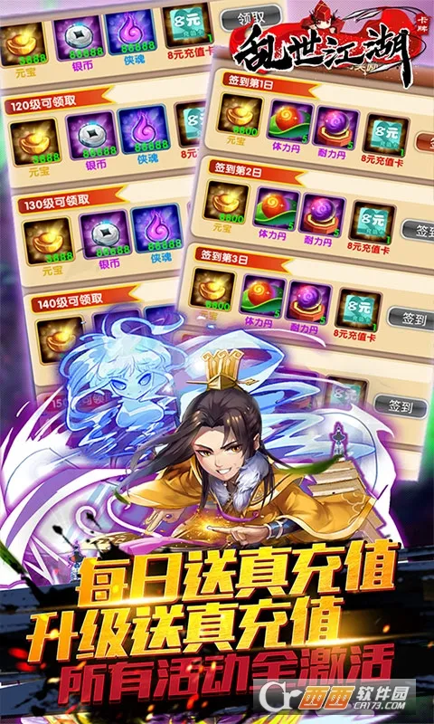 3、福利优厚:开局送超V,有独家1元商城,道具1元购,商城买元宝10倍购买,还有真充值卡系统,升级、登录、月卡都送充值。
