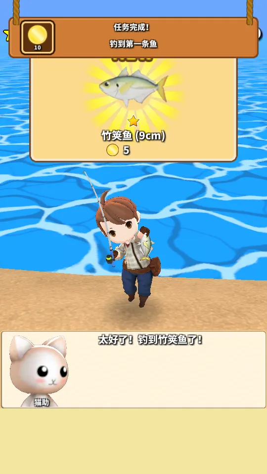 4、特色玩法体验:能扩建猫村,钓的鱼越多猫咪回来越多;可升级钓具挑战大鱼,还有天气温度影响钓鱼,玩法丰富。