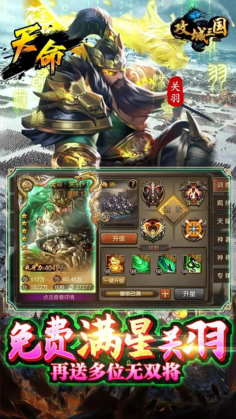 攻城三国是一款三国策略游戏,多种版本可选。玩家化身指挥官,招揽名将排兵布阵攻城略地。有丰富玩法与福利,如上线送多种资源,还有经典战役、远征西域等获取铜钱粮草途径,武将养成、兵种相克,同屏激战等你来。