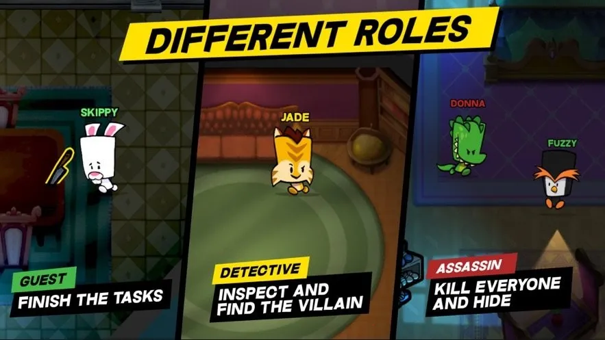 2. 身份随机策略多变,每局分配不同身份,目标玩法各异。凶手暗杀逃脱,客人搜集线索,义警精准报复,让每局战术千变万化。