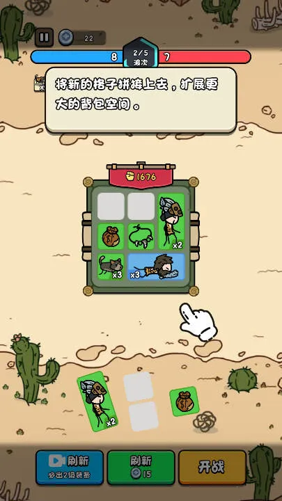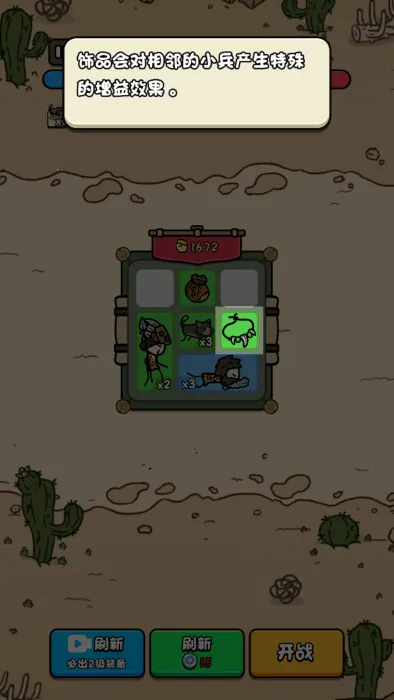 1. 玩法简单易上手,安装后打开将小兵拖入背包,放入后能看到士兵排列数量,合成相同士兵即可,钱袋图标每回合获银币,项链装备提供增益效果,战斗全自动。