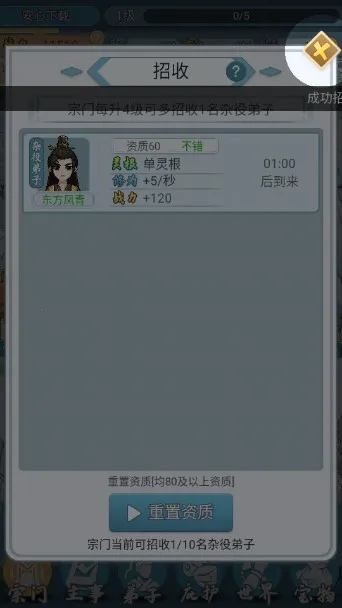 2、弟子招募不限数量,资质随宗门等级动态解锁,可广纳八方弟子,甄别灵根资质,因材施教授功法等。