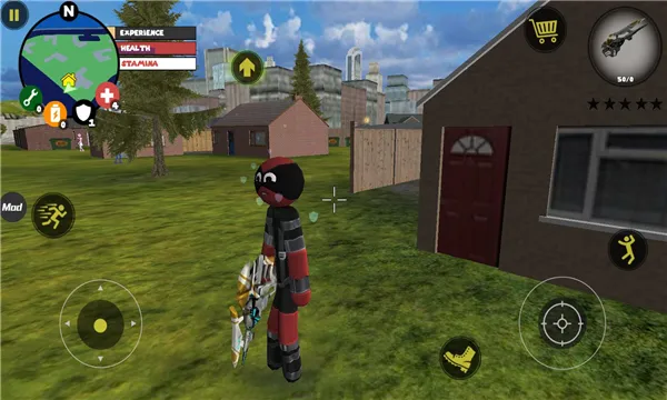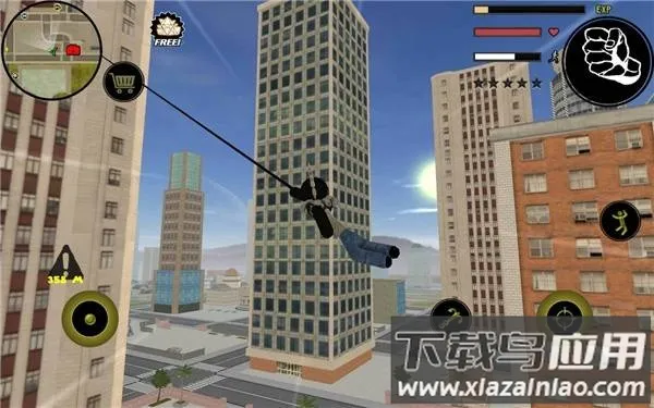 1. 操作方面,左侧控制移动加速,右侧操作绳索、攻击跳跃,右上侧能切换武器,血量和经验值实时显示。玩家可自由尝试,不过与其他角色交火时,杀敌人获经验,过多击杀会提升通缉星级,吸引警察等注意,要在攻击中生存并完成任务。