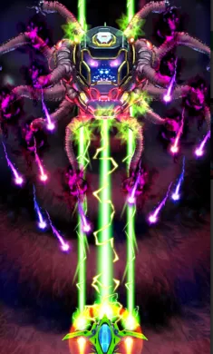 3. 探索不同星系区域,面对独特敌人和挑战,升级飞船装备强大攻击,考验射击技巧。