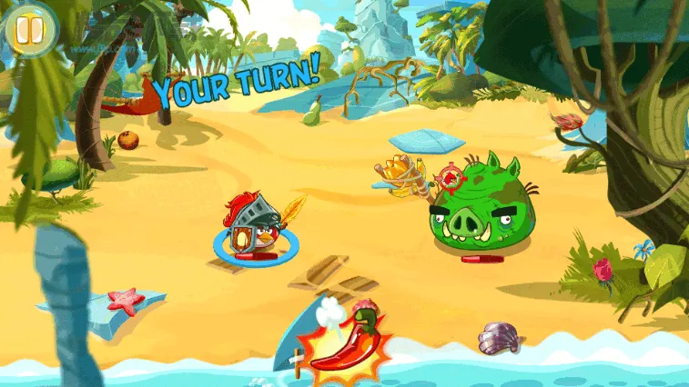 3. 回合制战斗,玩家组建小鸟战队与绿猪军团对战,利用小鸟技能与怒气机制积攒暴怒椒提升伤害击败敌人。