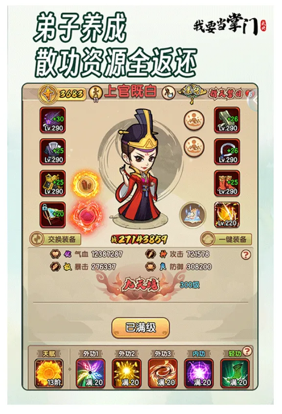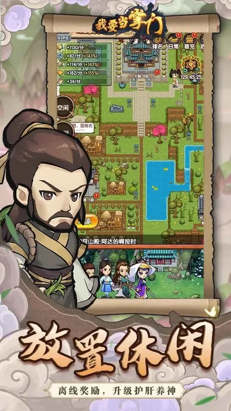 《我要当掌门 2025 官方最新版本》是国风武侠模拟经营手游。玩家化身掌门,招募弟子、建设门派、探索剧情、参与竞技。游戏玩法多样,有丰富功法,支持休闲放置,不肝不氪,带你体验独特江湖。