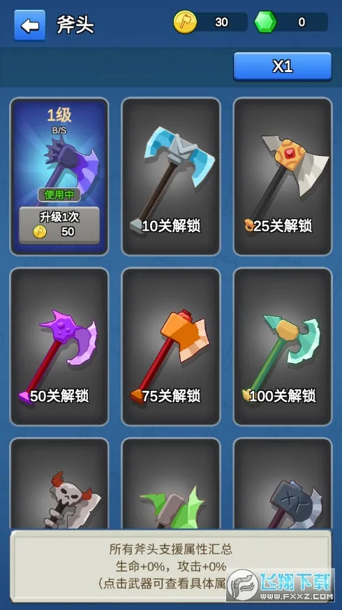 4、拥有多样斧头可供收集,随机属性自由组合,还有数百关卡和多种模式,玩法丰富。