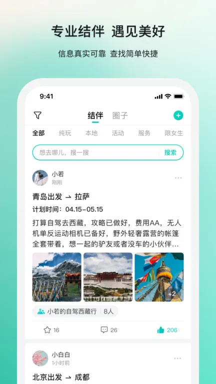 1、专业结伴,信息真实可靠,查找简单快捷,能轻松找到志同道合的旅伴。