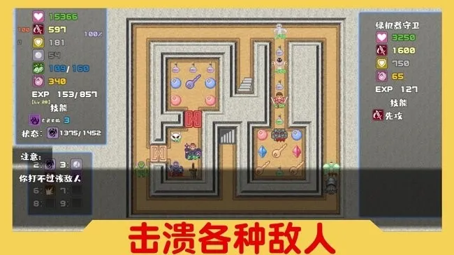 4、游戏对经典魔塔怪物重新绘制,超60种敌人,玩家需掌握敌人技能,打败领主和魔王,打造自己的冒险之旅。