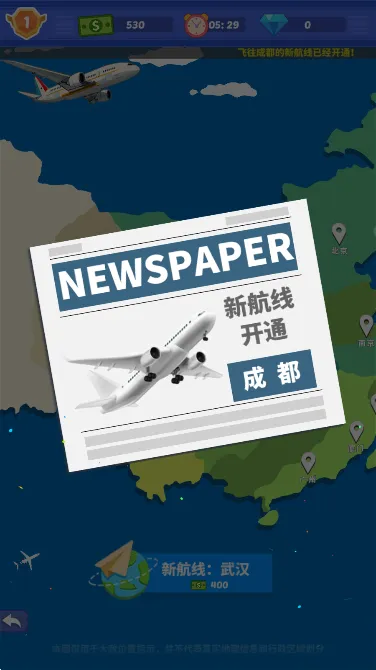 3、城市探索与投资,飞抵目的地能探索地标、品尝美食,投资当地设施提升航线热度。