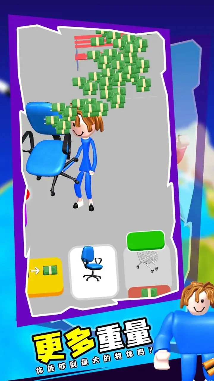 2、游戏有丰富多样的关卡挑战,收集不同体积重量物品参与比赛,完成比赛可获金币提升人物属性,还能解锁更多酷炫装扮。