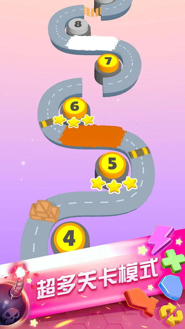 2、多样道具:游戏里存在各种道具,像加速器、金币、道路修复道具等,合理使用可助力玩家轻松完成关卡挑战。