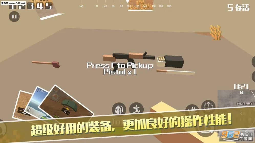 1、风格与适配良好。采用复古像素建模打造3D荒野场景,角色可爱,30MB超小体积能适配低配置设备,离线也可流畅运行。