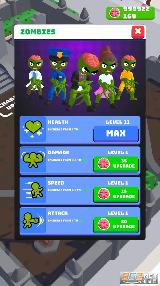 3、可定制游戏策略,选择升级特征,如最大友军僵尸生命值、伤害、攻击速度和移动速度等。