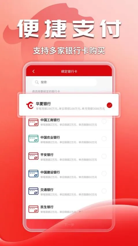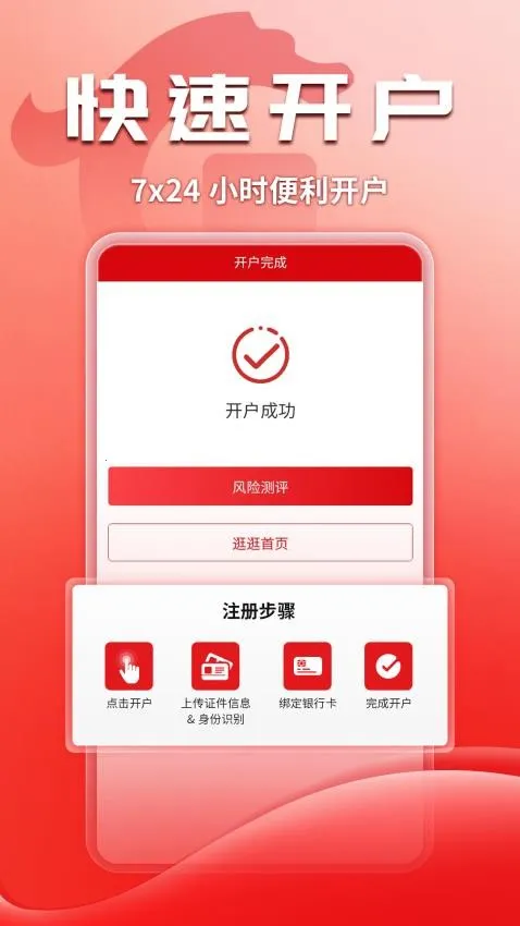 4、使用时一键安装,点击开户上传资料审核,审核通过就能投资。可根据行情选产品交易,还能快速绑定银行卡支付,新用户开户成功可抽奖获丰厚奖励。此软件适配安卓系统,资源下载稳定,功能完整无阉割,安装流程简单,是理财不错之选。