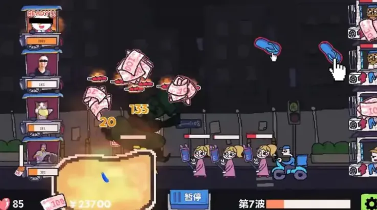 4、独特画面风格:采用纯2D画面,画风类似简笔画。角色造型魔性,我方是经典梗图,敌人是夸张小人,故事性十足。战斗特效夸张,暂停后全员出击画面热血,如同燃起来一般。