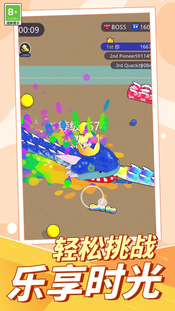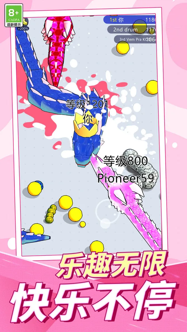 1、吞噬成长乐趣十足,在游戏中控制小蛇不断吞噬食物、对手来增长身体长度,每次身体变长都能带来满满的成就感。比如通过精准吞食黄色能量豆,每吞噬10颗体长增加一节,成长进化的过程让人乐此不疲。