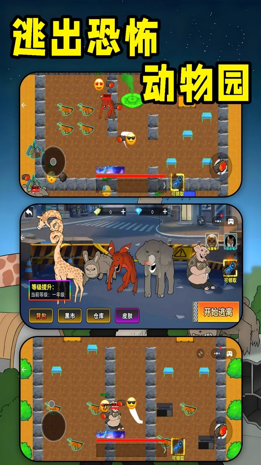 1、游戏玩法丰富多样。开局有多种动物NPC和巡逻保安,玩家点击开始进入逃亡,用虚拟摇杆控制移动,搜寻变异标本兑换积分,还能更换服装。新手可先选简单区域,发现物资后及时撤离。