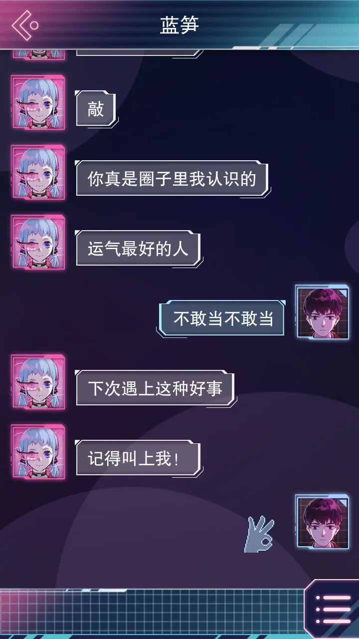 3、游戏亮点颇多,采用叙述聊天手法,玩家做选择决定未来;有X因素影响剧情;开放式剧情充满神秘色彩。特色包括沉浸交互、多支线选择、赛博朋克式浪漫等,还有打工系统、直男送礼等有趣设定。