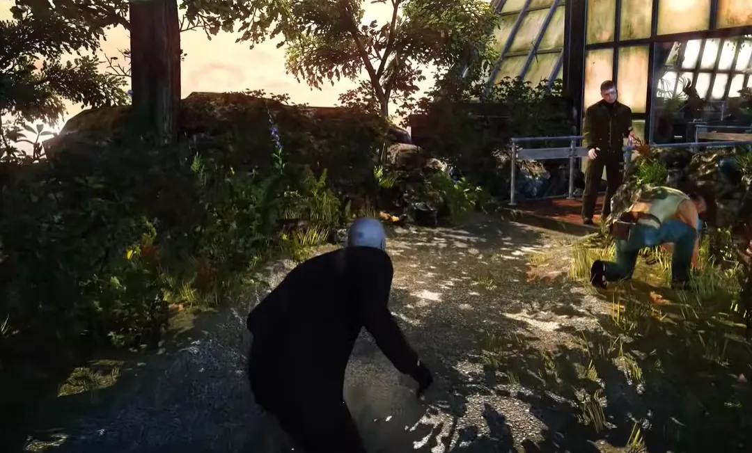 花房外平台只有两名敌人。趁一名守卫走到栏杆边眺望大海时,从背后靠近将他推下去;或者换上他的制服继续行动。随后以同样方式解决第二人。