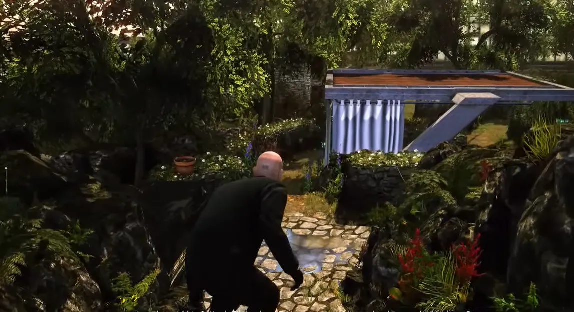 本作加入了全新的掩体系统。躲在树干后使用消音手枪解决第二名守卫,并把尸体藏进垃圾桶中。继续前进,在网球场可以看到一个正在打电话的守卫,你可以用钢丝绞杀,也可以悄悄绕过。再往右转下石阶,干掉第四名守卫并把尸体拖到角落。转角处有存档点,别忘了手动保存。