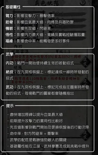 3. 战斗系统改良自井字棋,易学难精。串连 OX 图案施展外功绝学,出招挡招要根据战局取舍,战斗前还需搭配好内外功,以智取胜。