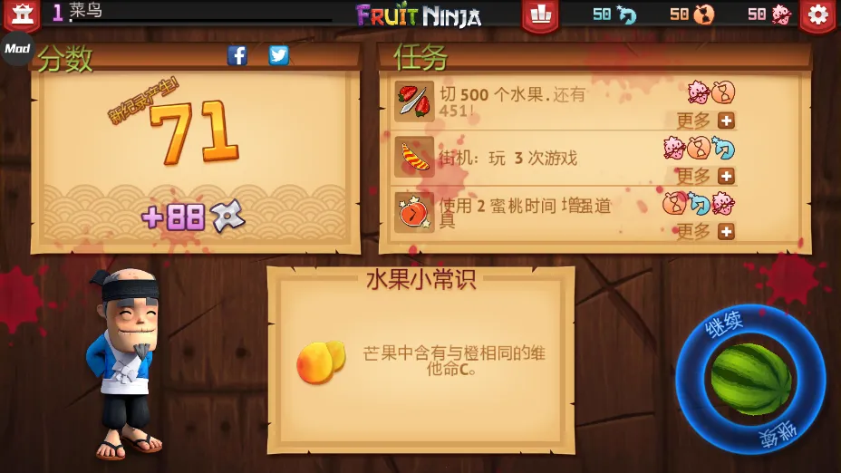 4、特色内容丰富:游戏加入全新模式、角色和功能性道具,有真实切水果体验和水果切割特效。还有连击刀刃、问卷反馈奖励、全新商城、刀刃升级等特色内容,且数据存档有保障。