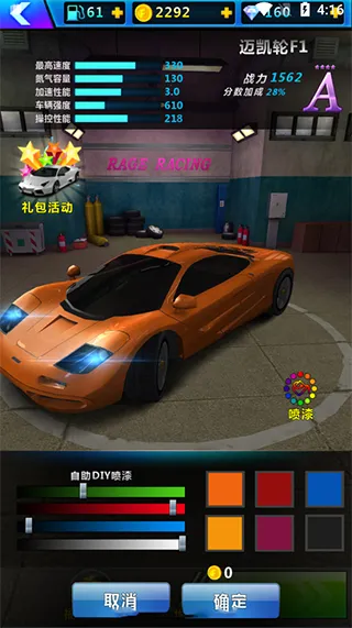 3、提供丰富改装选项,包括车身涂装、轮胎更换等,支持自定义贴花设计,可打造个人专属赛车,还能参观其他玩家车库并点赞。