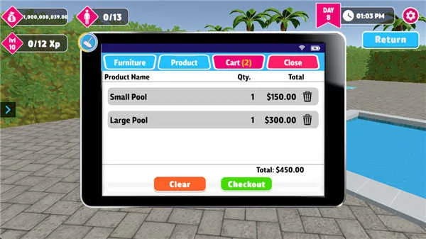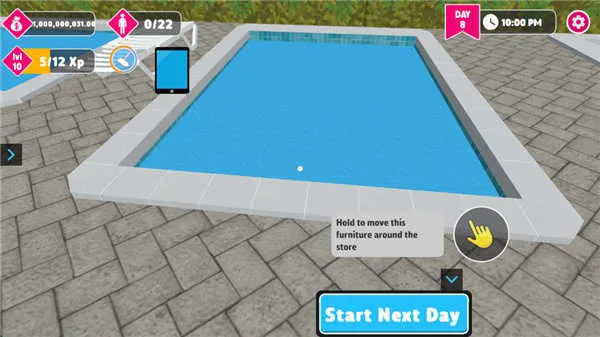 3、新手攻略明确,从清理地面、进商店购物,到放置设施、为顾客购票结账等都有详细步骤,还教你应对溺水情况及取消泳池操作。