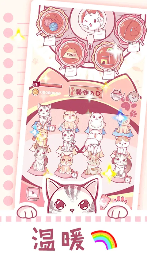 2、游戏玩法简单,采用合成与放置玩法,带来轻松的养成体验。各种猫咪根据真实猫咪设计,千奇百怪的小猫可随意收集收养,打造专属猫咪王国。