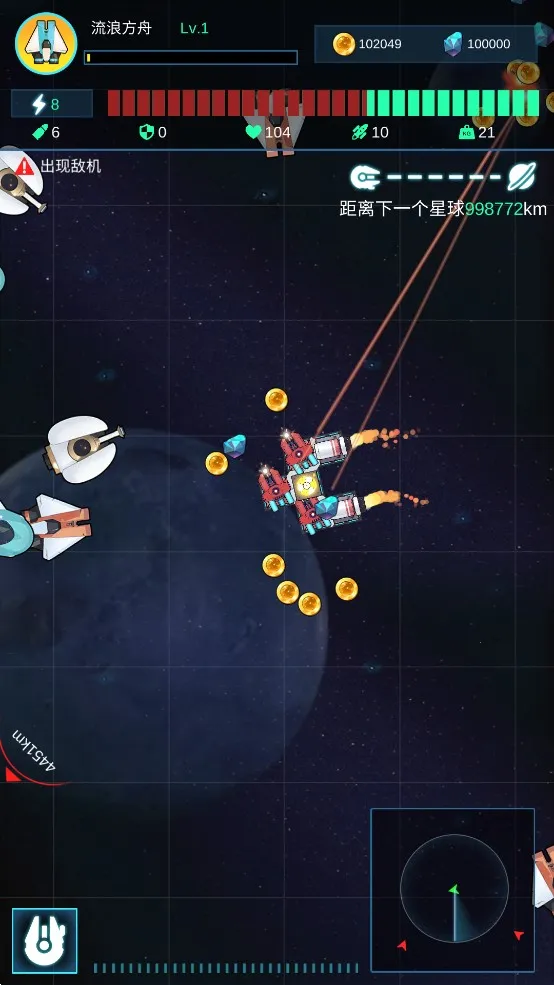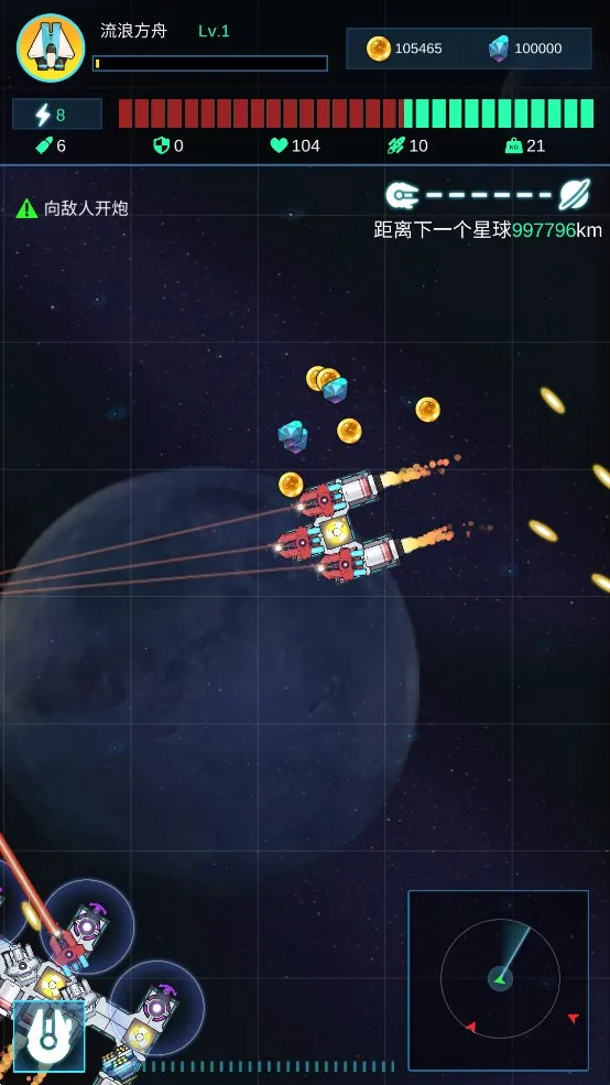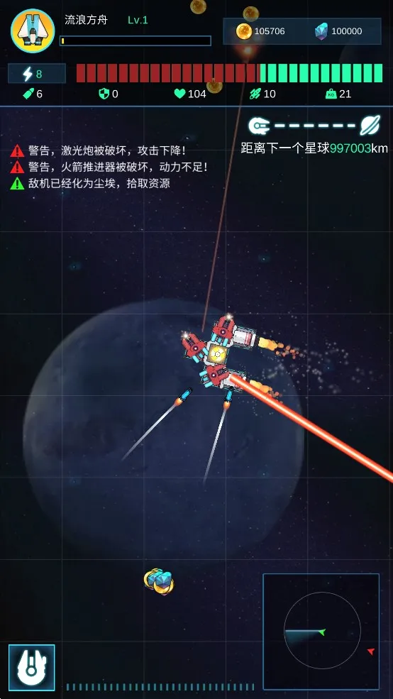 2. 可通过挂机任务积累能源与矿物,用于强化飞船装备与研究科技。